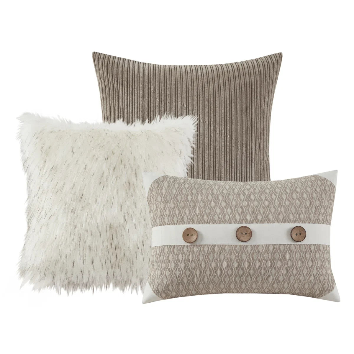 Elevate your bedroom with the luxurious style of the Madison Park Signature Grace Geometric Jacquard Comforter Set. This oversized jacquard comforter features 2 geometric patterns, in taupe and ivory, pieced together with decorative button accents, for a glamorous look. An overfilled removable insert, secured by inner ties and button closure, eliminates visible bar tacking lines from the top of the bed, for a clean duvet-style aesthetic. Also included are 2 shams and 2 Euro shams (3 in King) that gorgeously pair with the comforter, while 2 square decorative pillows and 1 oblong decorative pillow provide the finishing touches to complete this luxury bedding set. Each decorative pillow features a removable cover with a hidden zipper closure and has either an ottoman weave, faux fur, or pieced design. Comforter Cover: dry clean only. Comforter Insert: machine washable.