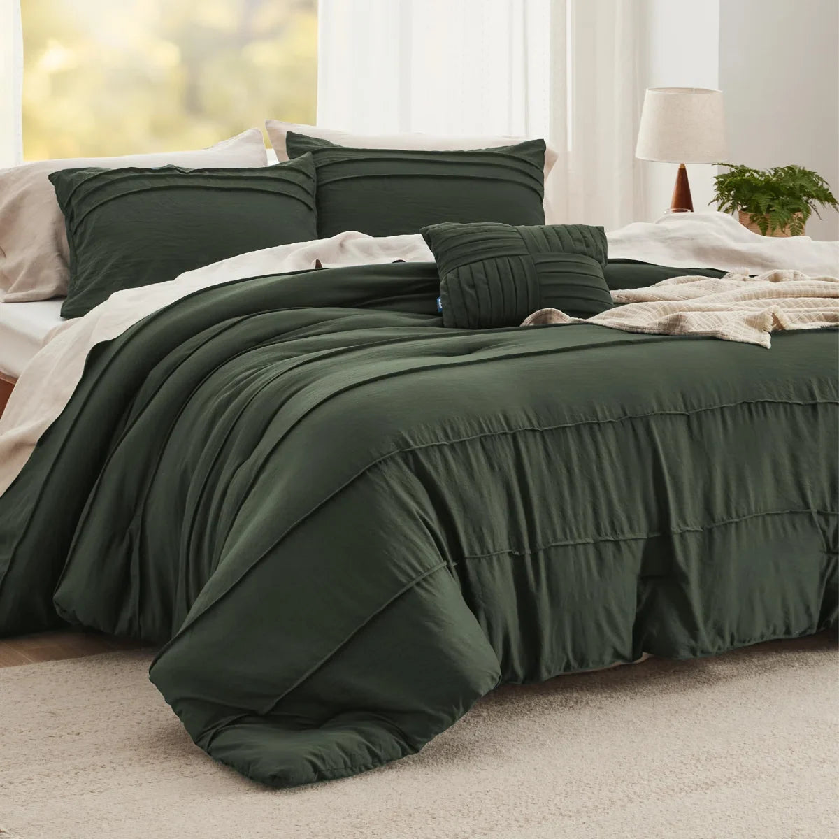 This Bedsure comforter set features elegant pinch pleats and a subtle stripe design for a refined look. Filled with soft microfiber and covered in prewashed fabric, it offers breathable, noise-free comfort. OEKO-TEX certified and easy to care for, it makes a cozy and thoughtful gift.